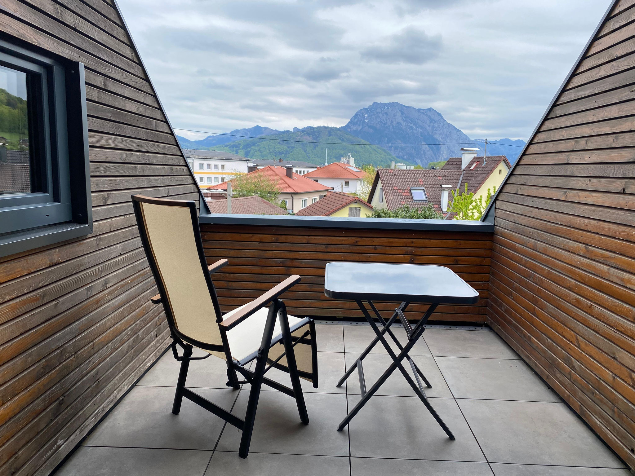 An sonnigen Tagen können Sie die Terrassen-Balkon-Area genießen und bei einem atemberaubenden Blick auf den Traunstein im Freien speisen.