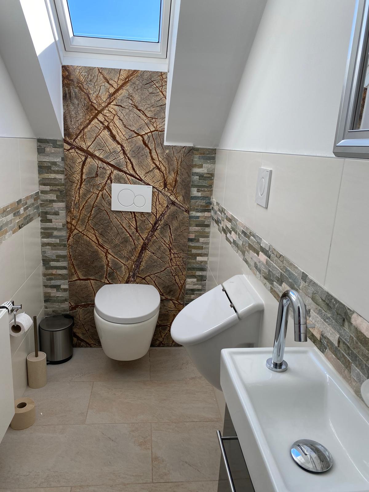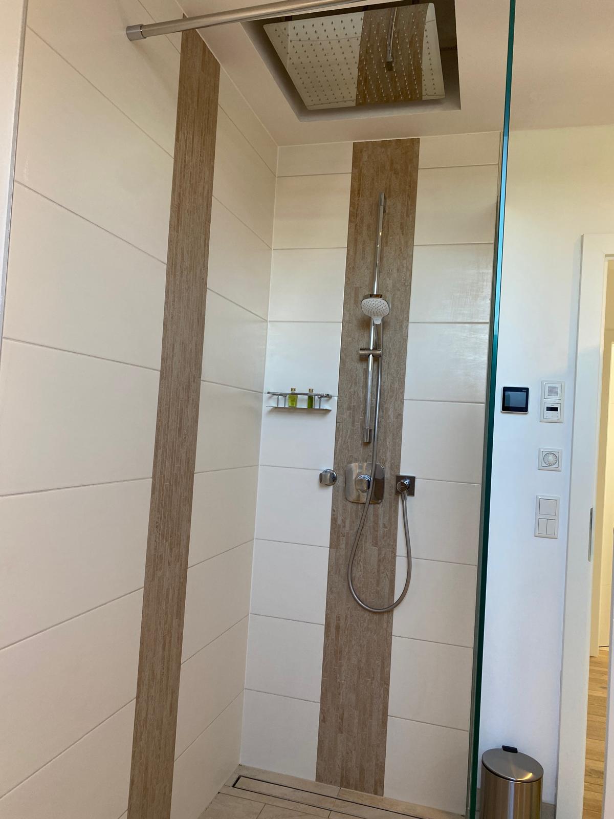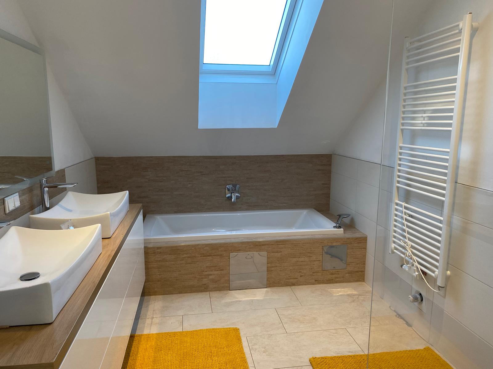Das moderne Badezimmer verfügt über eine Badewanne und eine begehbare Dusche, sodass Sie sich nach einem erlebnisreichen Tag im Salzkammergut entspannen können.